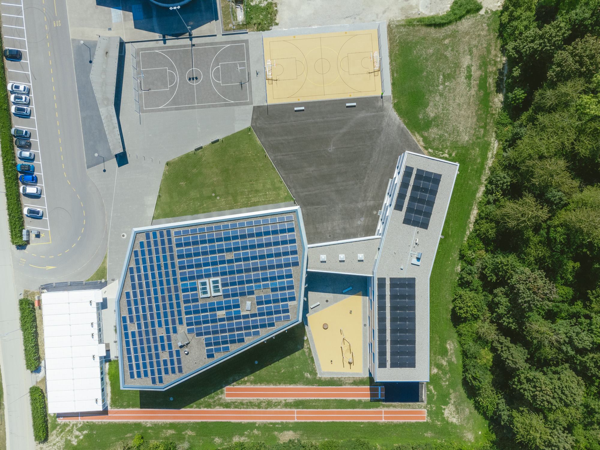 Soucieuse de durabilité, l’extension bénéficie d’un système énergétique performant utilisant la chaleur produite par la centrale de plaquettes de bois du complexe scolaire. La ventilation double-flux, les installations sanitaires optimisées et le traitement complet de l’eau garantissent un confort optimal pour les élèves comme pour l’équipe éducative.