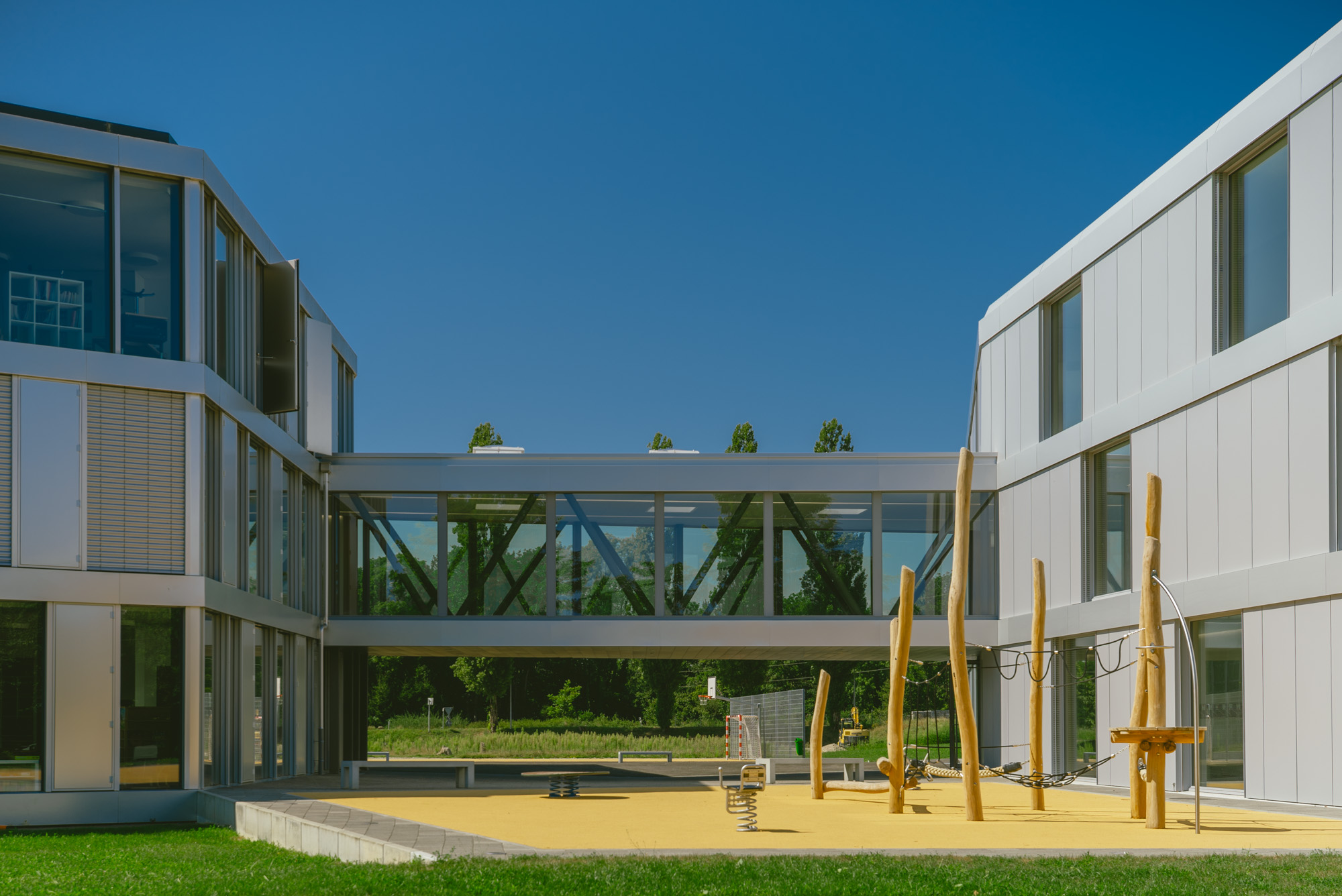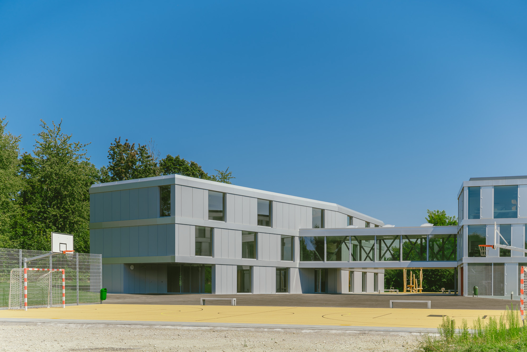 Cette extension scolaire a été pensée comme un véritable lieu de vie, lumineux et connecté à son environnement. Le projet crée un ensemble harmonieux qui s’intègre naturellement au bâtiment existant grâce à une passerelle élégante et à des espaces fluides répartis sur plusieurs niveaux.