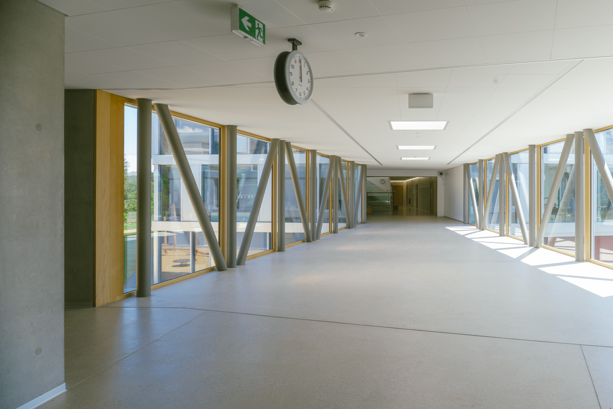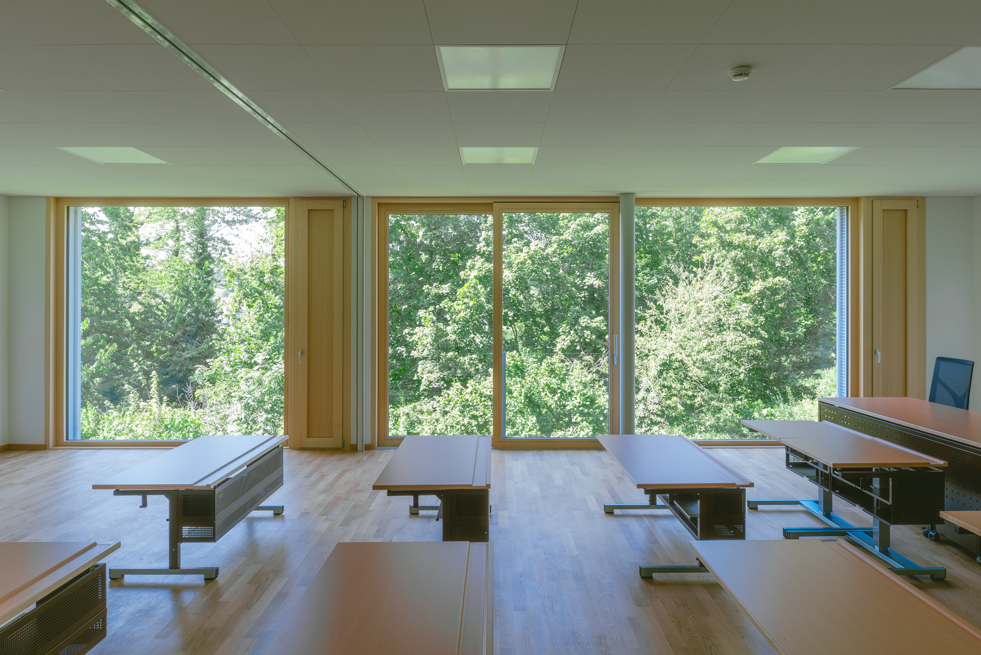 Les nouvelles salles de classe, les bureaux et les zones de dégagement offrent un cadre d’apprentissage moderne et fonctionnel. Les matériaux ont été choisis avec soin : une structure mêlant béton apparent et bois pour une atmosphère chaleureuse, des façades ventilées à l’esthétique contemporaine, ainsi que des finitions robustes adaptées à l’usage quotidien.